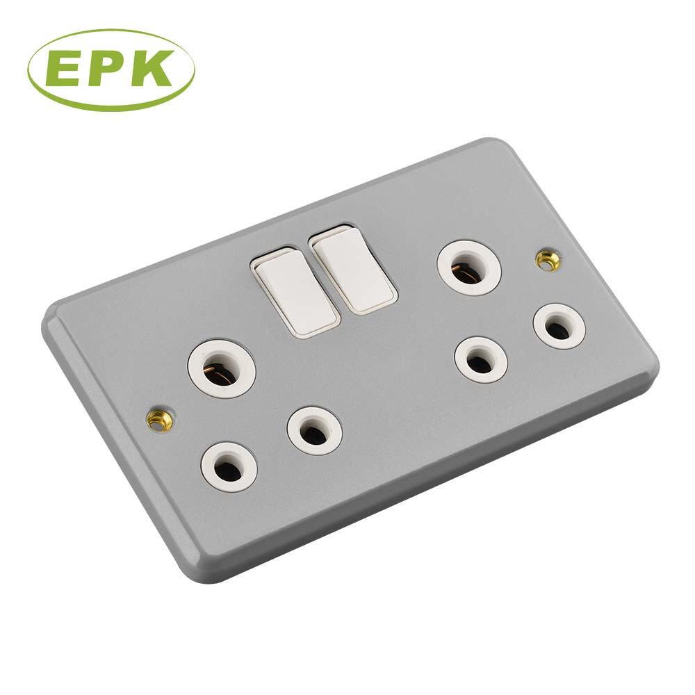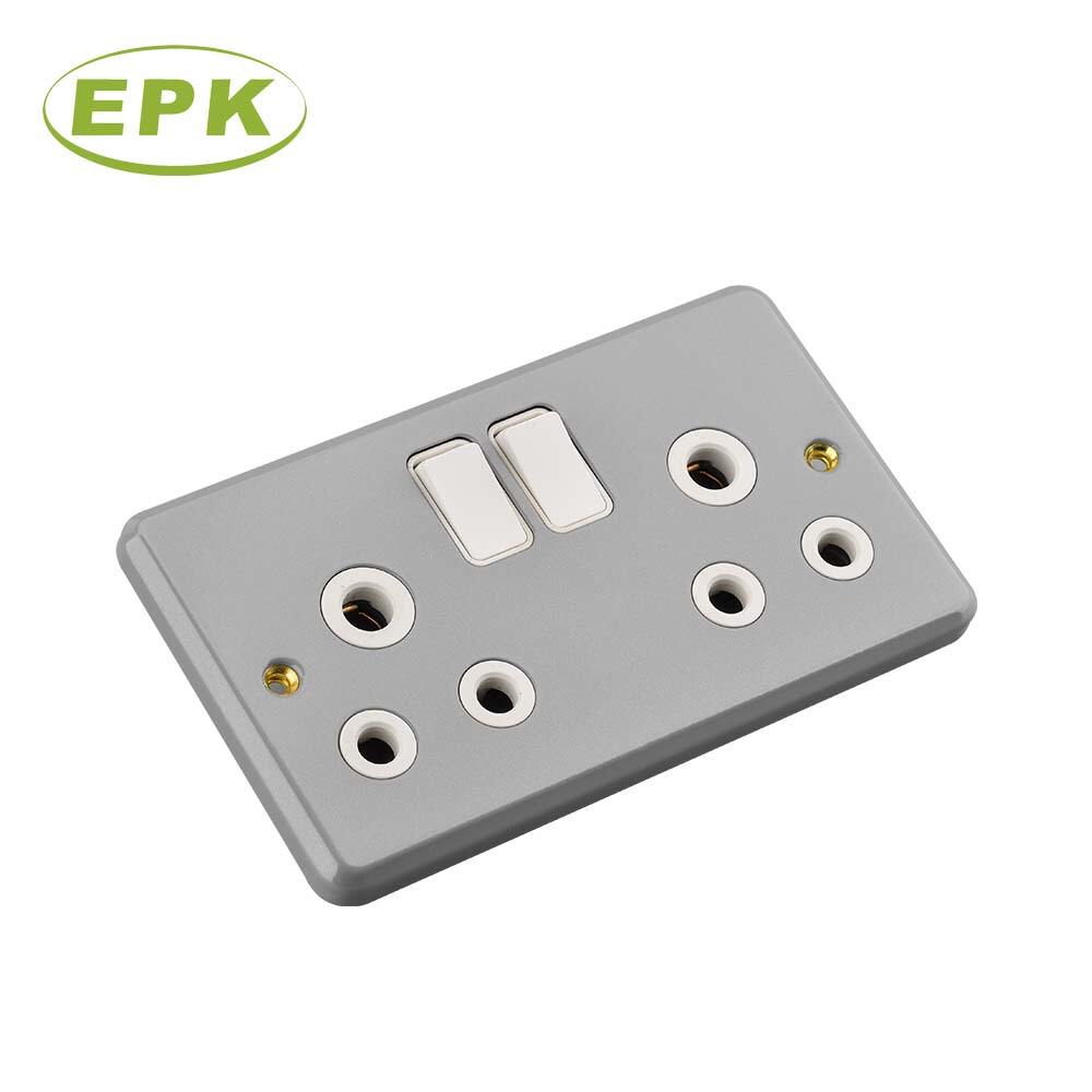 3915SD Industrial Metal Clad 15A Double Switched Sockets Grey Surface Mounted Twin Wall Socket BS 546 Standard Compliance Durable Stainless Steel and PC Panel Copper Internal Terminals Heavy Duty Power Outlet for Garage Workshop Factory