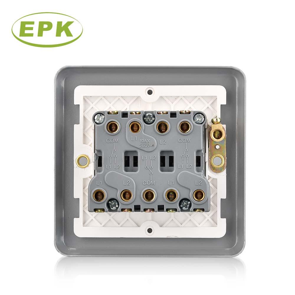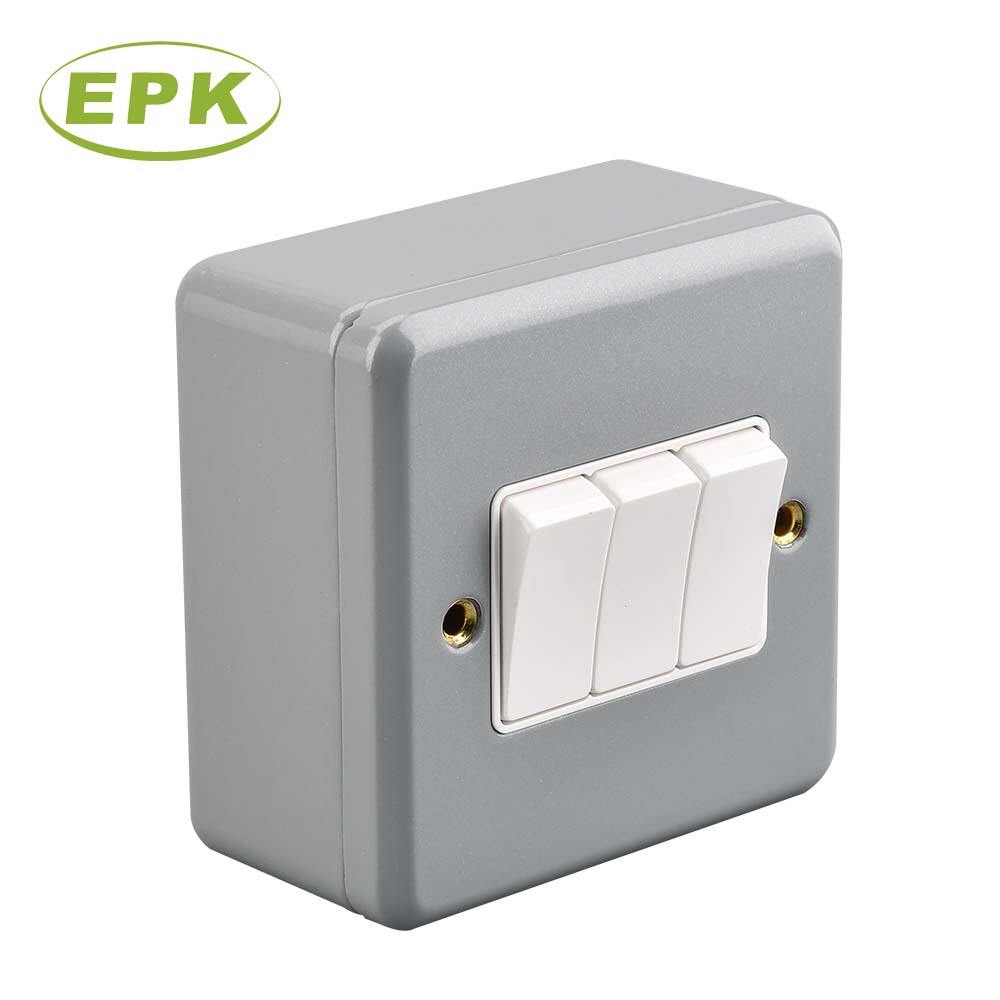 The EPK Model 3032 is a robust 3 Gang 2 Way Metal Clad Switch designed for complex electrical circuits in demanding environments. Featuring a triple-rocker design, this switch provides centralized control for three separate lighting zones from one or more locations, significantly enhancing operational efficiency in large spaces. The exterior is constructed with a high-strength Stainless Steel and PC (Polycarbonate) panel, finished in a professional industrial grey powder coating that provides exceptional resistance to impact, scratches, and corrosion.