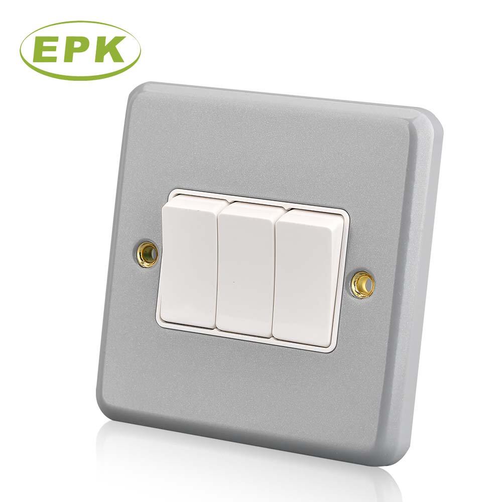 EPK Model 3032 Metal Clad 3 Gang 2 Way Light Switch, 10A 250V Surface Mounted Industrial Wall Switch, Triple Rocker Heavy Duty Grey Stainless Steel & PC Panel, 86mm x 86mm x 46.3mm Multi-Control Electrical Switch
